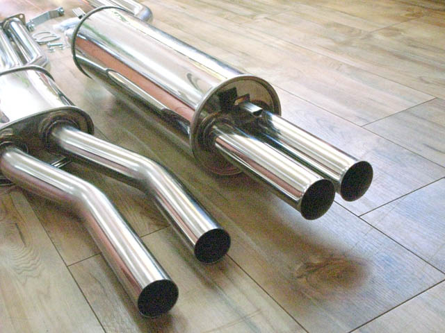 このマフラーは、外観だけのデュアルマフラーでなく、徹底的な排気効率を追及するために、メインパイプからデュアル化し、更にパイプの曲げ角度も限りなく小さくして、より効率的でスムーズな排気を実現しました。メインサイレンサーは、特殊な2-1-2と理想的な集合排気構造、テールサイレンサー内部はストレートチューブを採用した極めて抵抗の少ないフルストレート構造と、あらゆる部分の構造設計はパワーアップを唯一つの命題として作製いたしました。材質:SUS304HL